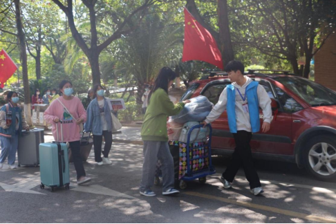 本次迎接新生活动在外院党委书记杨竹、龙立华和两个新生班级班主任的加入和引领下有序进行。受疫情影响,此次新生进校分为三批,从10月25号开始,10月27号结束。前两天28名志愿者均是按照流程2完成迎新工作,27号由于志愿者都有专业课,27号进校的新生在逸夫楼进行开学手续办理。