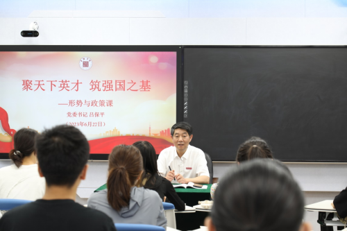 6月27日,校党委书记吕保平以“聚天下英才,筑强国之基”为题,为2021级英语专业3班学生讲授了一堂精彩生动的形势与政策课。