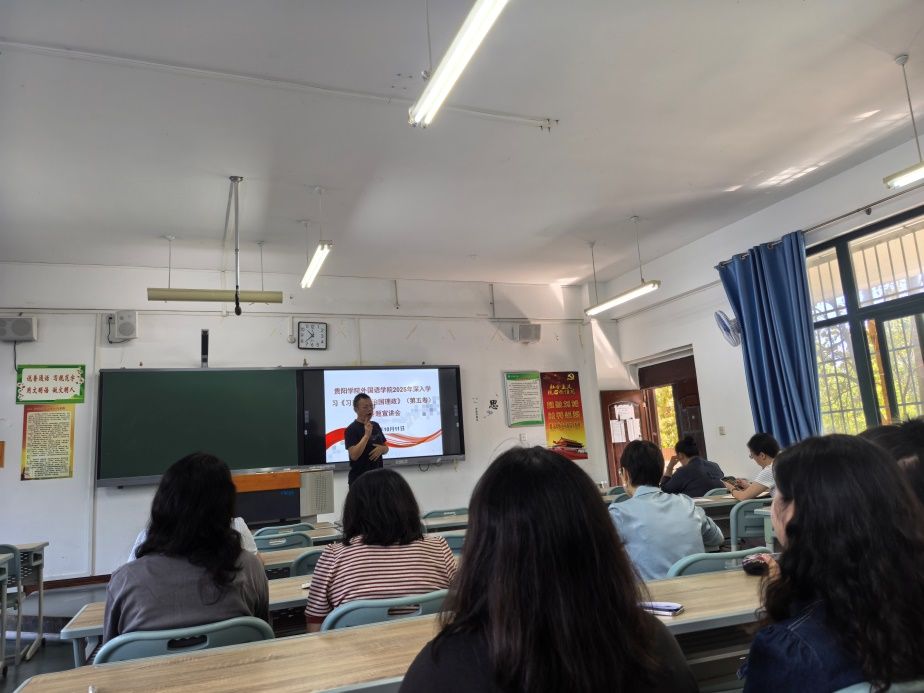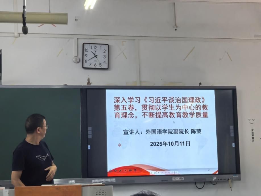 2025年10月11日,教师党支部在逸夫楼306教室开展了主题党日活动。此次活动得到了学院领导的高度重视,由学院副院长陈荣同志亲自主持并全程引领。全体党员齐聚一堂,气氛庄重而热烈,共同深入学习了《习近平谈治国理政》第五卷的丰富内容和深刻思想。在学习过程中,陈荣同志不仅对书中的核心思想和理论精髓进行了详尽而透彻的解读,还结合实际教育工作,特别强调了要将这些先进理念切实融入到日常教学工作的每一个环节中。他明确提出,要切实践行以学生为中心的教育理念,不断优化和改进教学方法和手段,持续提升教育教学的整体质量和水平。