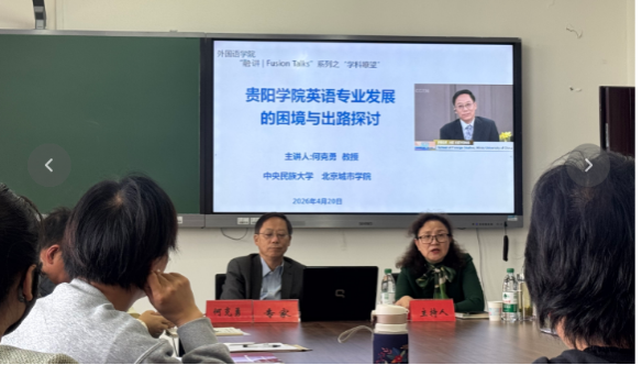 2026年4月22日,外国语学院在逸夫楼4311会议室举办“融·讲|Fusion Talks”系列之“学科瞭望”研讨会。会议以“贵阳学院英语专业发展的困境与出路探讨”为主题,特邀中央民族大学外国语学院二级教授、博士生导师、北京城市学院教授何克勇先生主讲。外国语学院党委书记、院长孟俊一教授主持会议,全体教职员工参加研讨。